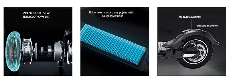 silnik: bezszczotkowy/indukcyjny, moc 350 W, nie rozmagnesowuje się i nie osłabia w wysokiej temperaturze;