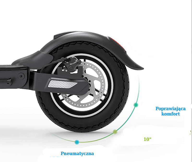 koła: pompowane, rozmiar 10 cali, zapewniają bardzo dobre parametry jezdne, szybkie i bezpieczne manewrowanie oraz odpowiednią przyczepność do podłoża;