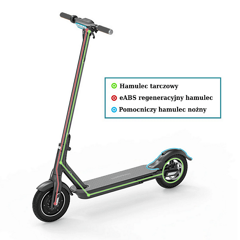 hamulce: przedni hamulec elektryczny z ABS (maksymalne dociśnięcie hamulca na rączce hulajnogi nie spowoduje zablokowanie przedniego koła), tylny hamulec tarczowy oraz możliwość mechanicznego hamowania poprzez przyciśnięcie tylnego błotnika. Potrójny system hamowania zwiększa bezpieczeństwo podczas jazdy i awaryjnego hamowania;